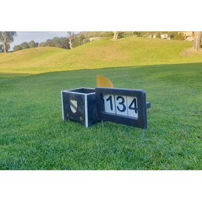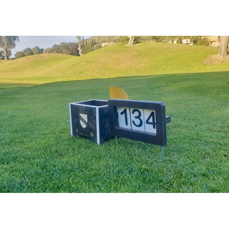 En la parte superior diagonal lleva una placa con la informaciones: Nº Hoyo, Mts, Hcp.